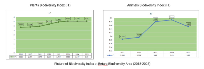 Refers to Latest Report of Biodiversity Status and Trendline at Betara Area, The Biodiversity index shows increase positively since 2018. The increasement index indicates that frequency, density, species richness and distribution value in positive way. Those values indicate that our efforts to preserve Biodiversity at Betara Area on track appropriately with Company’s Goals. Thus, the significant impact keeps our ecosystem in better ways such as the availability of food chain and water supply for all species within the Habitat. In other hand, PetroChina International Jabung Ltd. Betara Area has initiated the Biodiversity Innovation this year concerning in Beringin Tree cultivation (Ficus sp.) as part of ecosystem maintainability around Betara Biodiversity Conservation Area.